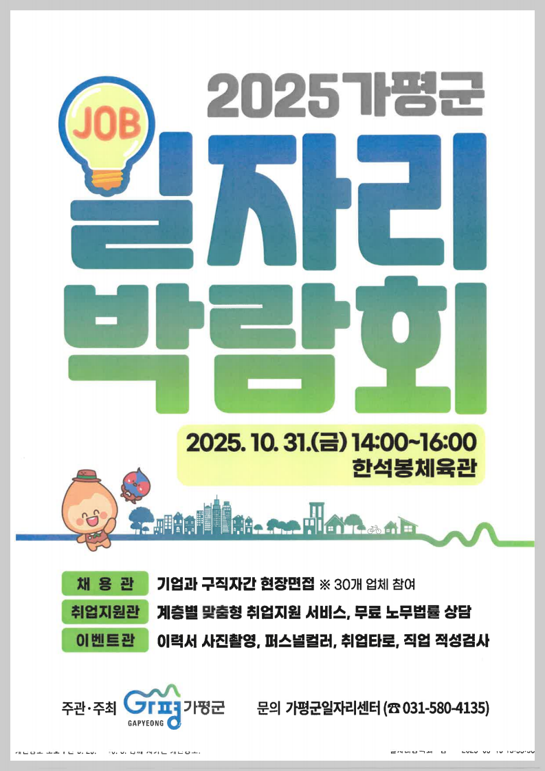 2025년 10월 31일(금) 오후 2시부터 4시까지 가평 한석봉체육관에서 열리는 가평군일자리박람회는 지역 내 최대 규모로 진행되는 채용 행사입니다. 이번 가평군일자리박람회에서는 30개 기업이 현장면접을, 20개 기업이 간접 참여해 구직자들에게 폭넓은 채용 기회를 제공합니다. 더불어 맞춤형 취업지원서비스와 무료 노무법률 상담을 받을 수 있는 취업지원관, 퍼스널컬러 진단·이력서 사진 촬영·취업타로·직업적성검사 등 다양한 체험을 즐길 수 있는 이벤트관이 운영됩니다. 구직자는 사전등록(일자리센터 방문 또는 고용24 구직신청)을 통해 입장할 수 있으며, 현장 등록도 가능합니다.