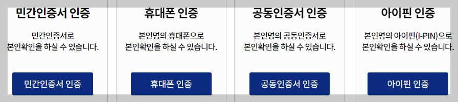 7.본인확인 방식 4가지(민간이증서, 휴대폰 인증, 공동인증서 인증, 아이핀인증) 중 한가지 방식을 선택하여 진행하시면 됩니다.