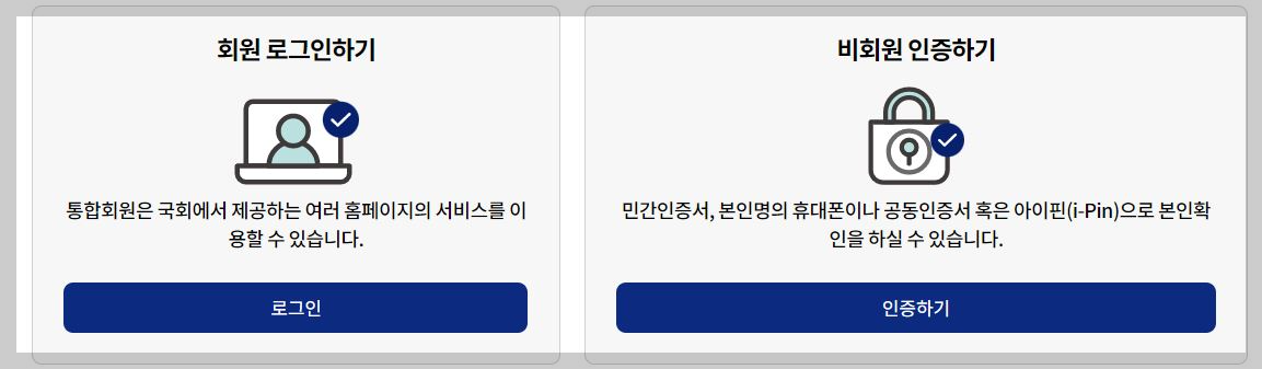 6. 국회전자청원홈페이지 회원일경우와 비회원일경우 선택을 진행합니다.