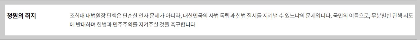 9월23 조희대 탄핵청원이 국민동의청원홈페이지에 작성된후 9월29일 국회전자청원 홈페이지에는 조희대 탄핵반대 청원이 작성되어 동의를 진행하고 있습니다. 조희대 탄핵 반대 청원 내용은 조희대 탄핵 반대 청원은 단순히 한 인사의 거취 문제가 아니라 사법부의 독립성과 헌정 질서를 수호해야 한다는 국민적 우려에서 비롯되었습니다. 국민의 시각에서 볼 때, 대법원장은 정치적 이해관계와 무관하게 법과 원칙에 따라 판단해야 하며, 이를 탄핵으로 흔드는 것은 사법부에 대한 신뢰를 무너뜨릴 수 있다는 걱정이 큽니다. 특히 무분별한 탄핵 시도가 반복될 경우 권력 분립이 훼손되고 민주주의의 근간이 흔들릴 수 있다는 우려가 제기되었습니다. 따라서 이번 조희대 탄핵반대 청원은 헌법적 가치와 사법부 독립을 지켜내기 위해 일반 국민들이 목소리를 낸 것으로, 사법부가 정치적 압력에 흔들리지 않고 본연의 역할을 다하길 바라는 염원이 담겨 있습니다.라고 밝히고 있습니다.