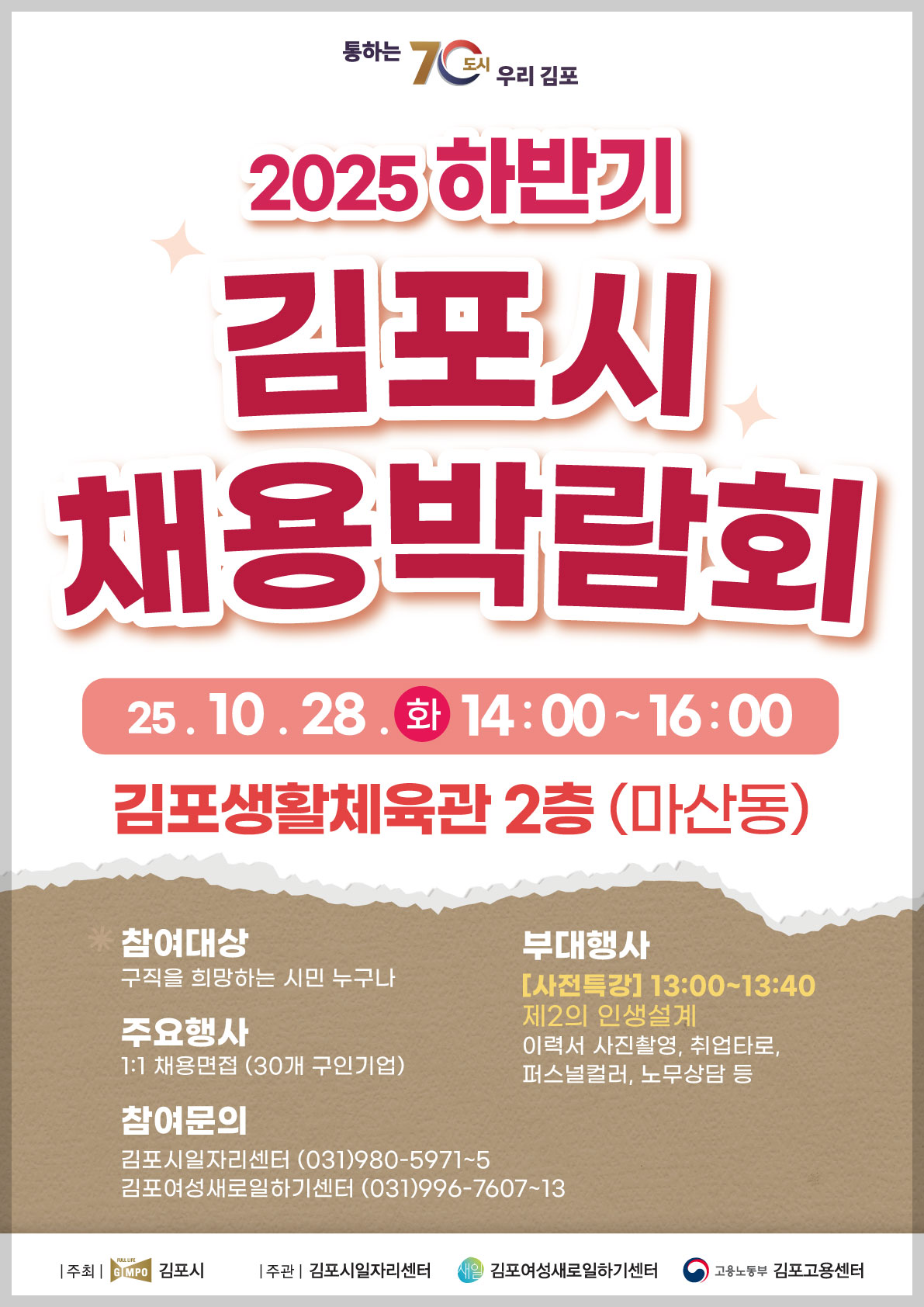 김포시는 구직자들의 안정적인 취업을 돕기 위해 2025 김포시채용박람회를 개최합니다. 이번 행사는 10월 28일(화) 오후 2시부터 4시까지 김포생활체육관 2층에서 진행되며, 사전특강은 오후 1시부터 시작됩니다. 김포시채용박람회에는 총 30개 기업이 참여하여 현장 면접과 이력서 접수를 통해 다양한 채용 기회를 제공합니다. 또한 취업지원서비스관에서는 이력서 컨설팅, 사진 촬영, 지문적성검사, 퍼스널컬러 및 메이크업 컨설팅 등 구직자 맞춤형 지원이 마련됩니다. 사전특강은 ‘제2의 인생설계’를 주제로 열려 청년뿐 아니라 중장년층에게도 유익한 시간이 될 것입니다. 홍보관에서는 김포시의 취업지원사업도 소개됩니다. 누구나 이력서를 지참해 현장 참여할 수 있으며, 현장 작성도 가능합니다. 구직자와 기업이 직접 만나는 소중한 기회인 김포시채용박람회는 실질적이고 다양한 지원으로 큰 호응이 기대됩니다. 이번 김포시채용박람회를 통해 새로운 도약의 발판을 마련하시길 바랍니다.