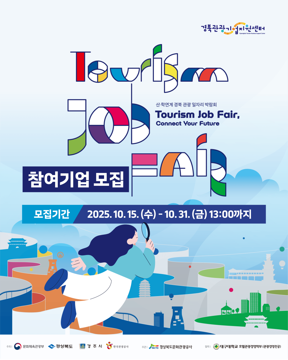 이번 경북 관광 일자리 박람회는 관광산업 분야의 구인·구직 활성화를 목표로 하며, 관광 관련 사업을 운영 중인 기업을 대상으로 참여 모집이 진행됩니다. 참여기업 모집 기간은 2025년 10월 15일(수)부터 10월 31일(금) 13시까지**로, 조기 마감될 수 있으니 선착순 신청이 권장됩니다.