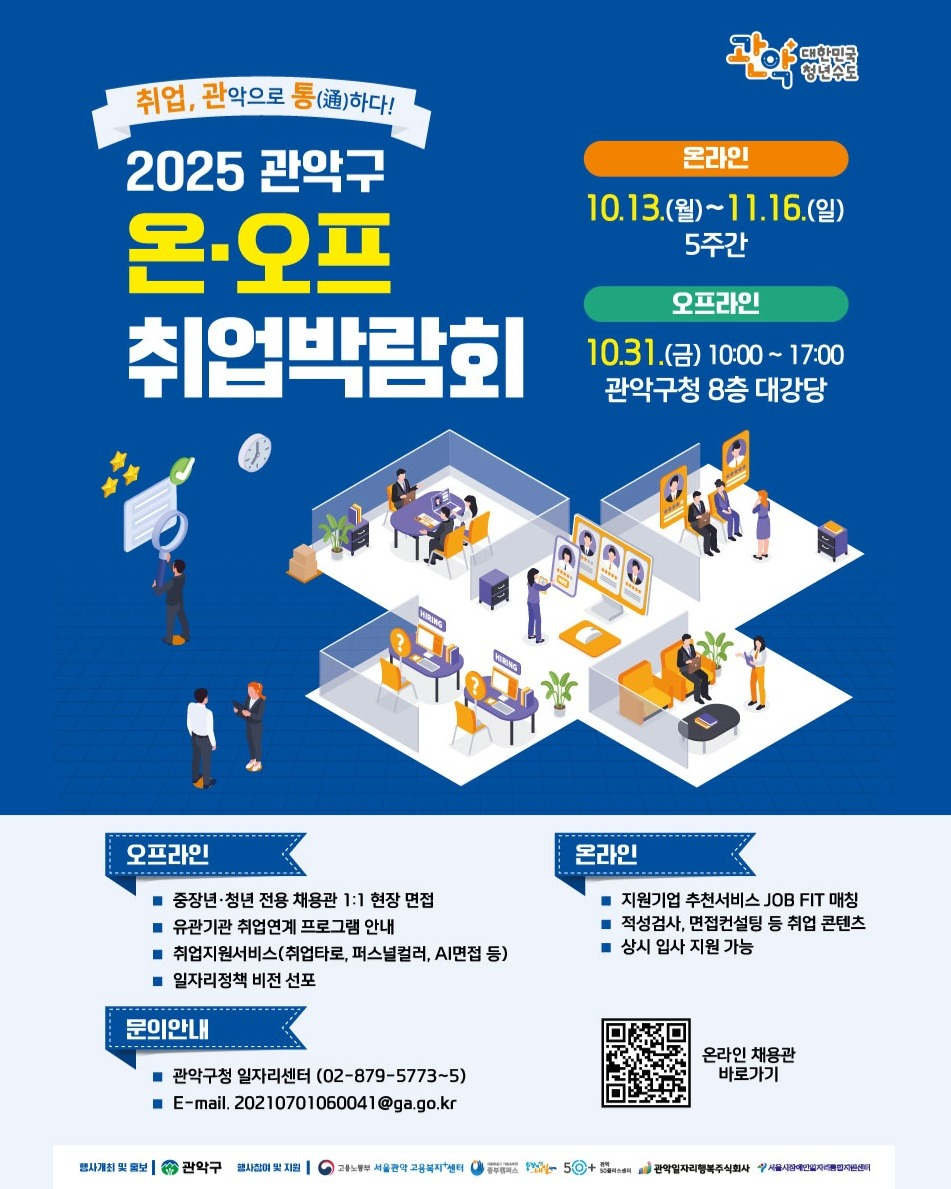오프라인 행사는 2025년 10월 31일(금) 오전 10시부터 오후 5시까지 관악구청 8층 대강당에서 열리며, 1:1 맞춤 면접, 취업 연계 프로그램, AI 면접, 퍼스널컬러 진단, 취업타로 등 다채로운 부대행사와 함께 현장 채용관이 운영됩니다.구직 중이신 분들께 큰 도움이 될 이번 행사에 많은 관심과 참여를 부탁드립니다.