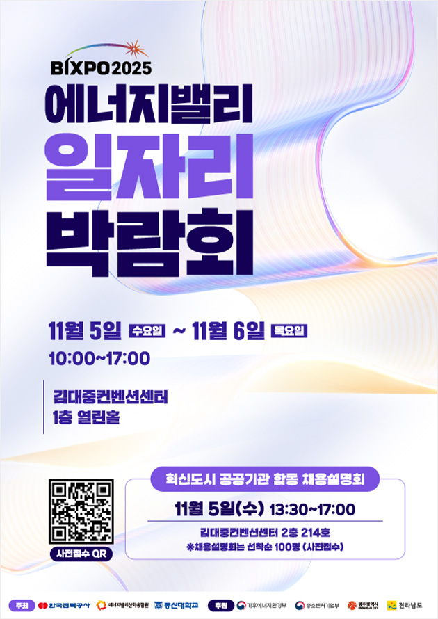 이번 제5회 2025 에너지밸리 일자리박람회는 취업을 준비하는 청년과 에너지산업 기업 간의 실질적 만남을 통해 새로운 기회를 제공하는 뜻깊은 행사입니다. 다양한 체험과 컨설팅, 이벤트를 통해 즐겁고 유익한 취업의 장이 될 것으로 기대됩니다.